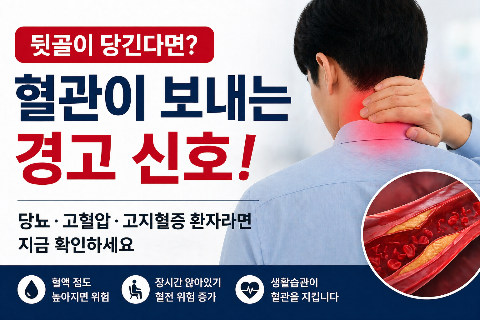 혈관은 70%가 막힐 때까지 아무런 신호를 보내지 않습니다. 남편이 뒷골이 당긴다는 말을 자꾸 하는데, 솔직히 처음엔 그냥 피곤해서 그런가 싶었습니다. 그런데 알고 보니 이게 혈관이 보내는 경고 신호일 수 있다는 걸 알고 나서, 가볍게 넘길 수가 없었습니다.