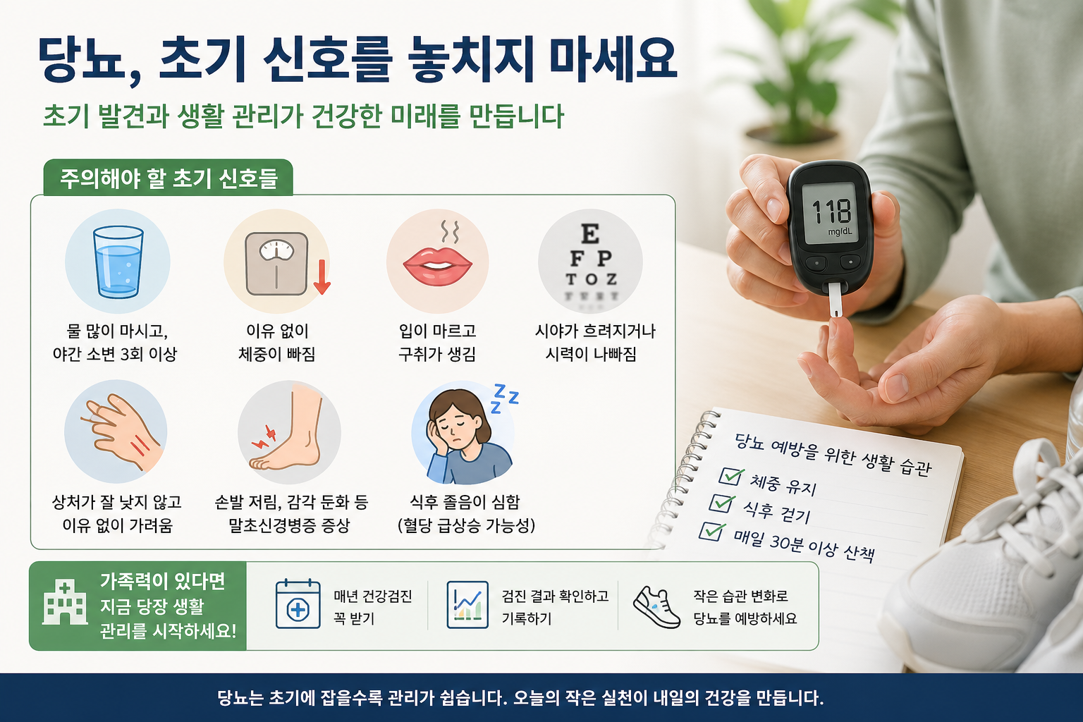 당뇨 초기에 주의 깊게 살펴야 할 신호들을 정리하면 다음과 같습니다.