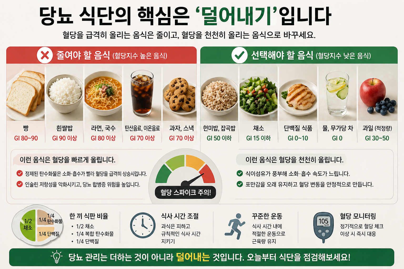 탄수화물을 줄이라는 말은 알겠는데, 구체적으로 뭘 어떻게 줄여야 할지 막막한 분들이 많습니다. 이때 기준이 되는 것이 혈당지수(GI, Glycemic Index)입니다. 혈당지수란 특정 음식을 섭취했을 때 혈당이 얼마나 빠르게 올라가는지를 수치화한 지표입니다. 55 이하면 낮은 편, 70 이상이면 혈당을 급격히 올리는 식품으로 분류합니다.문제는 우리가 즐겨 먹는 빵, 떡, 면이 대부분 혈당지수 80에서 90을 웃돈다는 점입니다. 특히 흰쌀밥은 혈당지수가 90 이상으로 매우 높습니다. 이런 음식들은 입으로 들어가는 순간부터 빠르게 소화·흡수되어 혈당을 급격히 끌어올립니다. 그러면 인슐린이 한꺼번에 대량 분비되고, 그 인슐린도 제대로 작동을 못하니 혈당은 쉽게 내려오지 않습니다.저는 이 부분에서 '그럼 뭘 먹어야 하나'보다 '뭘 줄여야 하나'로 질문을 바꾸는 것이 중요하다고 생각합니다. 당뇨 관리를 위해 덜 먹어야 할 고혈당지수 식품을 정리하면 다음과 같습니다.